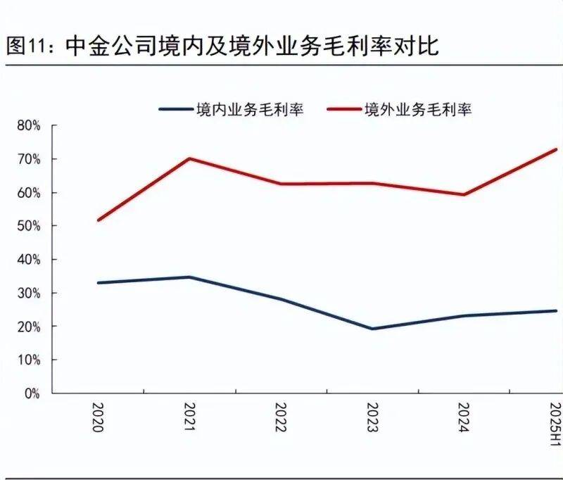 目前,中金国际以控股公司身份在中国香港、纽约、新加坡、伦敦、法兰克福和东京等世界各主要金融中心设立子公司或分支机构,并积极在“一带一路”地区拓展业务。目前,中金公司已在境外建立了证券研究、投资银行、机构经纪、资产管理和财富管理等业务平台。近年来,中金公司境外业务收入占比稳中有升,截至 2025H1,公司境外业务收入达 40.24 亿元、收入占比31.4%。此外,由于公司在境外开展的主要是经纪、投行、资管等轻资产业务,公司境外业务毛利率显著高于境内业务。