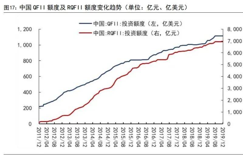 2002 年 11 月,中国证监会、中国人民银行、国家外汇管理局联合颁布《合格境外机构投资管理暂行办法》,合格境外投资者制度正式出台。自2002 年推出以来,QFII 已经成为香港及其它境外投资者参与中国资本市场的重要渠道。而RQFII由QFII 创新而来,是境外机构直接使用境外人民币投资境内市场的制度,于2011年正式开始实施。2019 年,国家外汇管理局宣布取消QFII 和RQFII 的投资额度和试点国家和地区限制。截至 2019 年末,QFII 额度共累计获批1,113.96亿美元,RQFII 额度共累计获批 6,941.02 亿元。