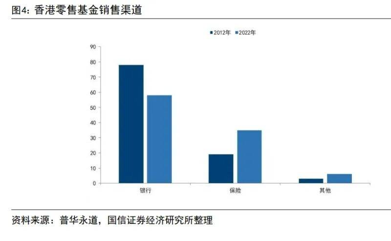 目前在各类型产品的分销渠道中,公募基金的数据有较详细统计,其他产品的分销渠道则缺乏统计数据。从产品类型来看,2024 年末香港公募基金市场规模(即认可单位信托及互惠基金资产净值)为 1.81 万亿美元,约合14 万亿港元,占香港资管市场规模的 40%,一定程度上也能代表香港资管市场的分销渠道情况。银行与保险是核心代销渠道。香港的主要金融产品分销渠道包括银行、保险、其他机构(如券商、独立财务顾问、基金直销等)。普华永道曾经估计过2022年香港零售基金的销售渠道情况,显示香港的零售公募基金销售渠道较为单一,银行、保险、其他渠道分别占比 58%、35%、6%(三者相加不足100%系四舍五入引起,原始披露值即如此),说明银行与保险机构是香港零售公募基金的核心代销渠道。从趋势来看,银行占比下降,保险、其他渠道占比提升。普华永道估计的数据显示,2012 年银行、保险、其他渠道在香港的零售公募基金销售占比分别为78%、19%、3%,相比之下,十年间银行渠道占比下降了 20 个百分点,保险占比提升了16 个百分点,其他渠道提升了 3 个百分点。